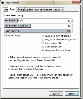 Now, in Inkscape -> Extensions -> Axidraw Control, open the setup tab, and select the “Low power for laser focus” setting. When ready, place a piece of cardboard under the laser hear and press apply to turn the laser on. Rotate the dial on the bottom of the laser to adjust to focus so that the beam is a small as possible. This focus may need to change if you use a material that is thicker, since it may be closer to your laser than when you focussed it initially.