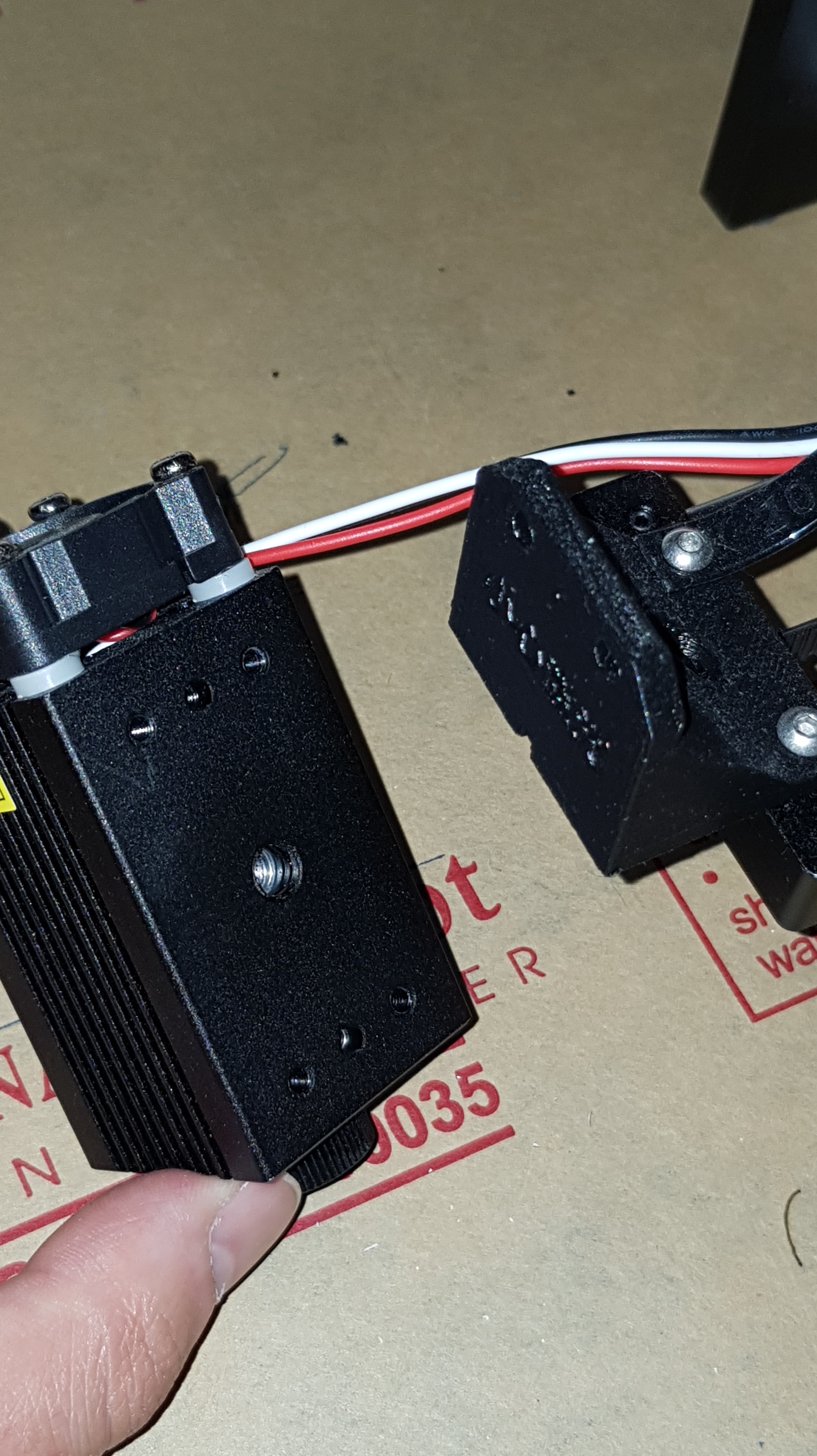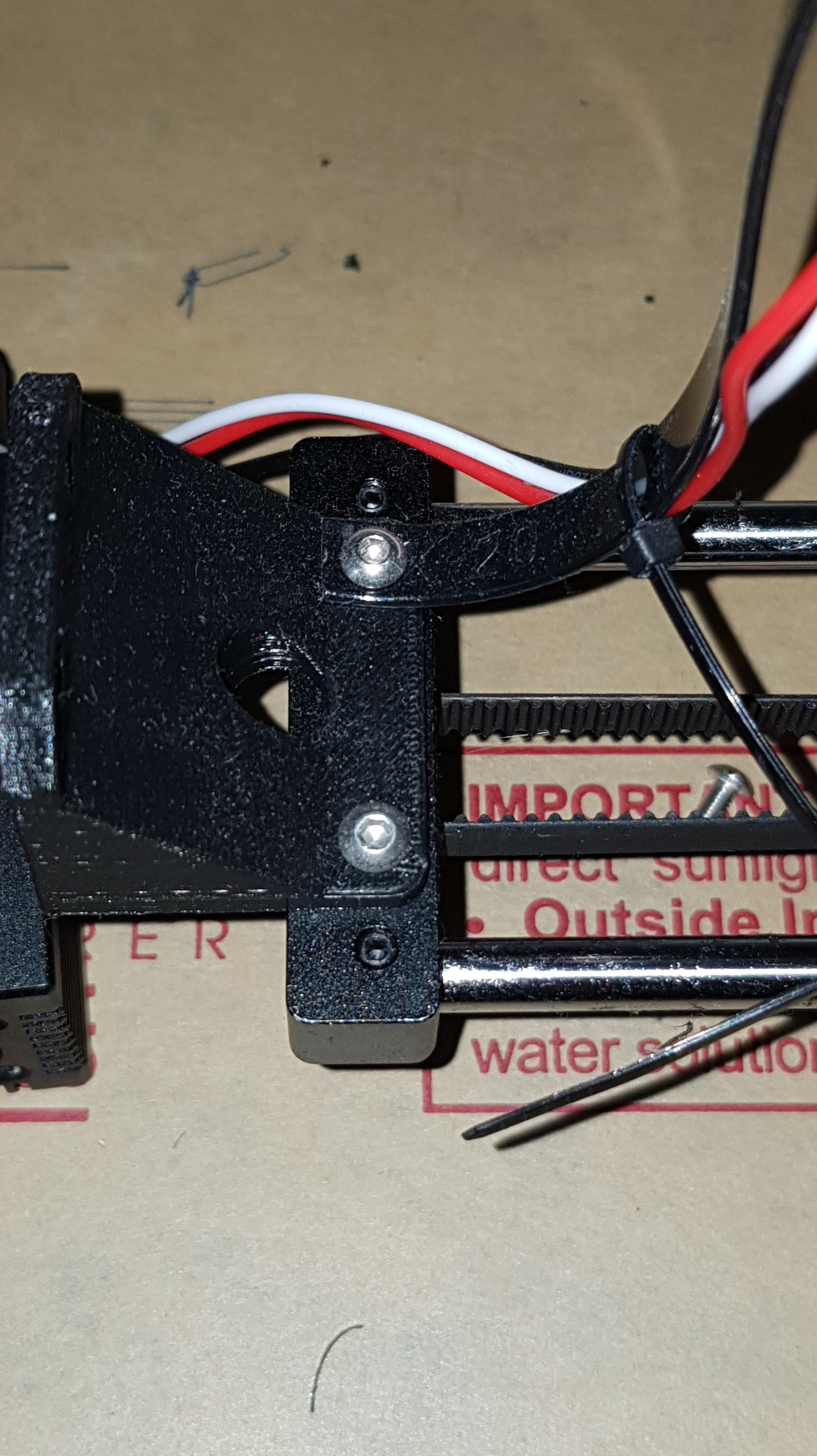 Attaching the laser head is very simple with only three components, the diode itself, the chamfered mount and another cable guide. Once attached, cable tie the laser engraver’s wires to the guide and trim.